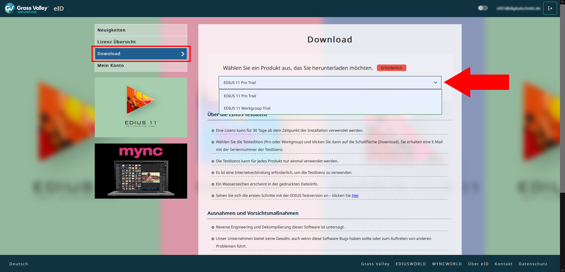 14. Klicken Sie im linken Menü auf [Download] und wählen Sie die gewünschte Testversion (Pro oder Workgroup).
