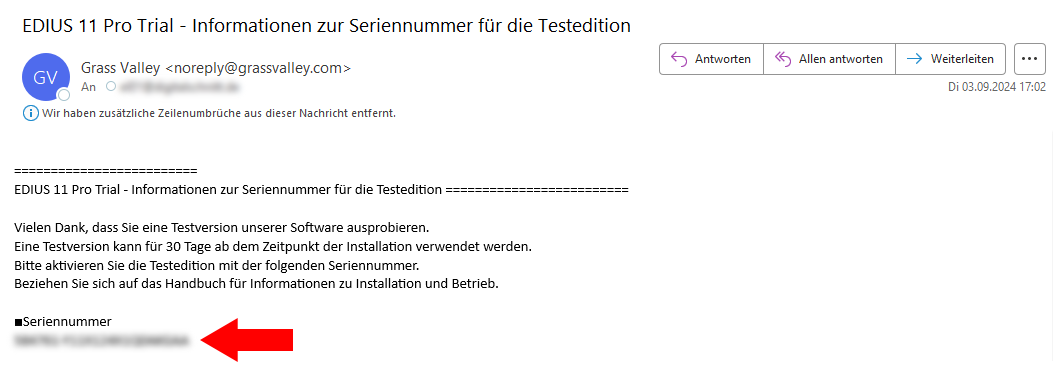 16. Sie erhalten dann eine E-Mail mit der Seriennummer für die gewünschte Testversion. Bitte gehen Sie zu Schritt 12, um die Lizenz zu aktivieren.