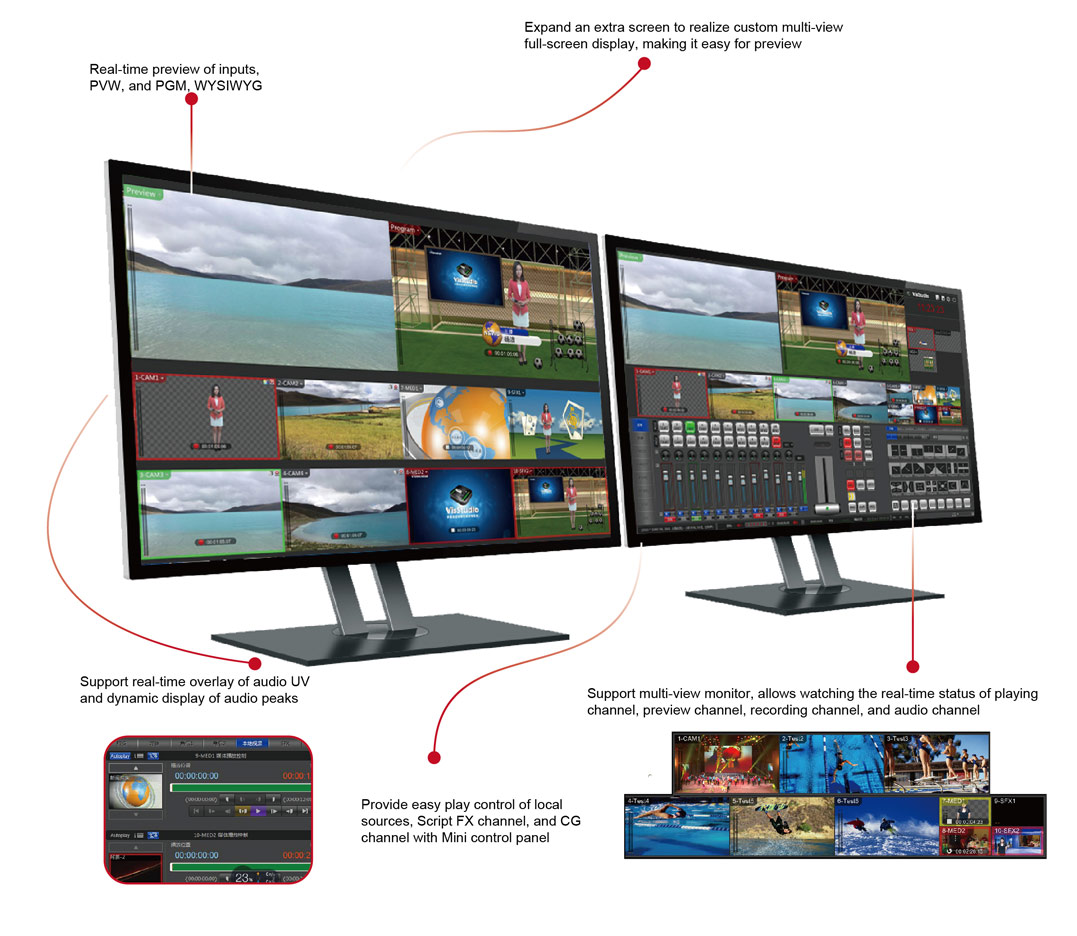 VisStudio basiert auf Windows 64bit und bietet als Video & Audio-Mischer/Aufnahme-System professionelle Broadcastqualität. Enthalten sind ein Video- und Audio-Mischer, Einblendoptionen für eine Vielzahl lokaler oder externer Computergraphiken. Logo- und Rahmenmarkierungen, Aufnahme und Streamingfunktionen sowie Chroma-Keying und ein virtuelles Studios machen diese Live-Produktions-Lösung zu einem perfekten Ersatz für umfangreiches Studio-Equipment, was dank VisStudio nicht länger benötigt wird. VisStudio eignet sich zum Einsatz bei Shows, Sport-Veranstaltungen, Hochzeiten und vielen weiteren Gelegenheiten.