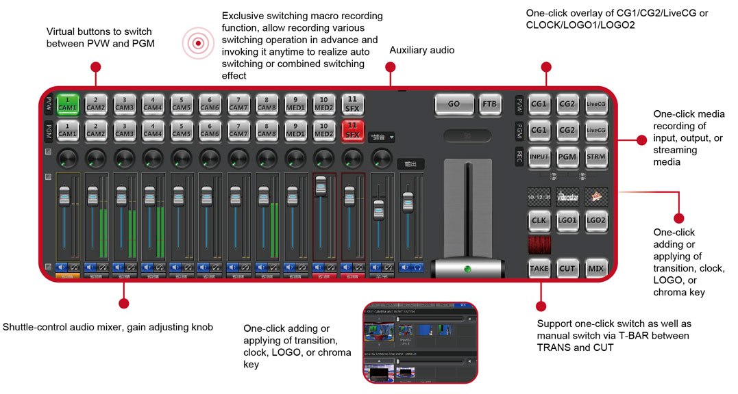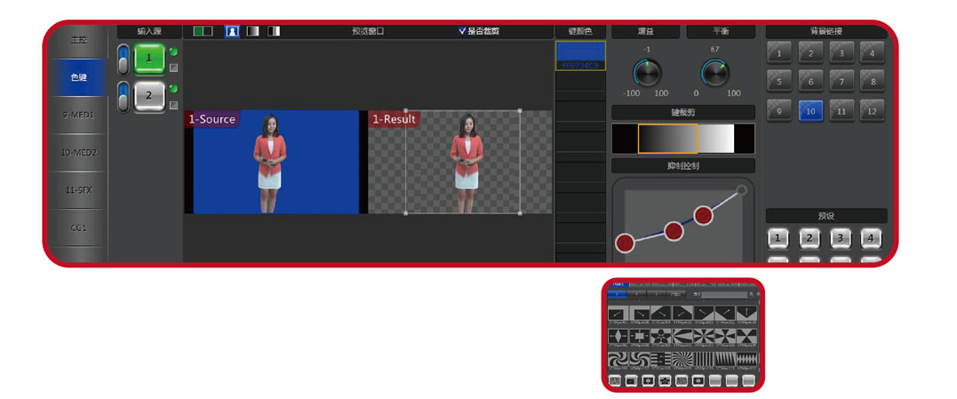--Unterstützt bis zu 2 virtuelle Studioeffekte, jede virtuelle Szene kann bis zu vier Kameraeinstellungen enthalten, die komfortabel per Keyframes realisiert werden können
