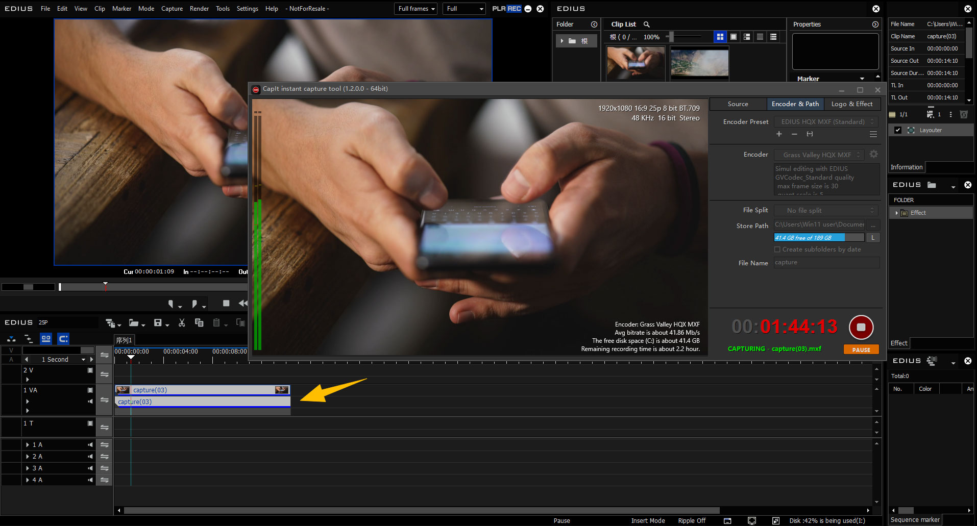 Mit CapIt können Sie aus einer Vielzahl von Quellen aufnehmen, darunter USB-Kameras, Blackmagic-DeckLink-Karten, NDI-Streams, RTMP/HTTP/RTSP/SRT-Feeds, Z-CAM-Geräte und sogar Smartphone-Screencasts. Es unterstützt die Echtzeitkodierung in H.264/H.265 MP4 mit GPU-Beschleunigung sowie Grass Valley HQ/HQX- und AVC-MXF-Formate für professionelle Workflows. Für Projekte mit hohen Produktionsdruck oder Liveanwendungen wie Replay ermöglicht CapIt das Schneiden bereits während der noch laufenden Aufnahme über wachsende MXF-Dateien – so können Sie in EDIUS mit dem Schnitt beginnen, ohne auf das Ende der Aufnahme warten zu müssen.